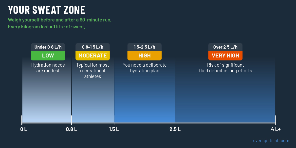 Sweat rates vary more than most people expect. Some athletes lose less than 500ml per hour. Others lose over 2 litres. Body size, fitness, heat acclimatisation, and genetics all play a role. “Drink 500ml per hour” might leave one person over-hydrated and another cramping by kilometre 25.